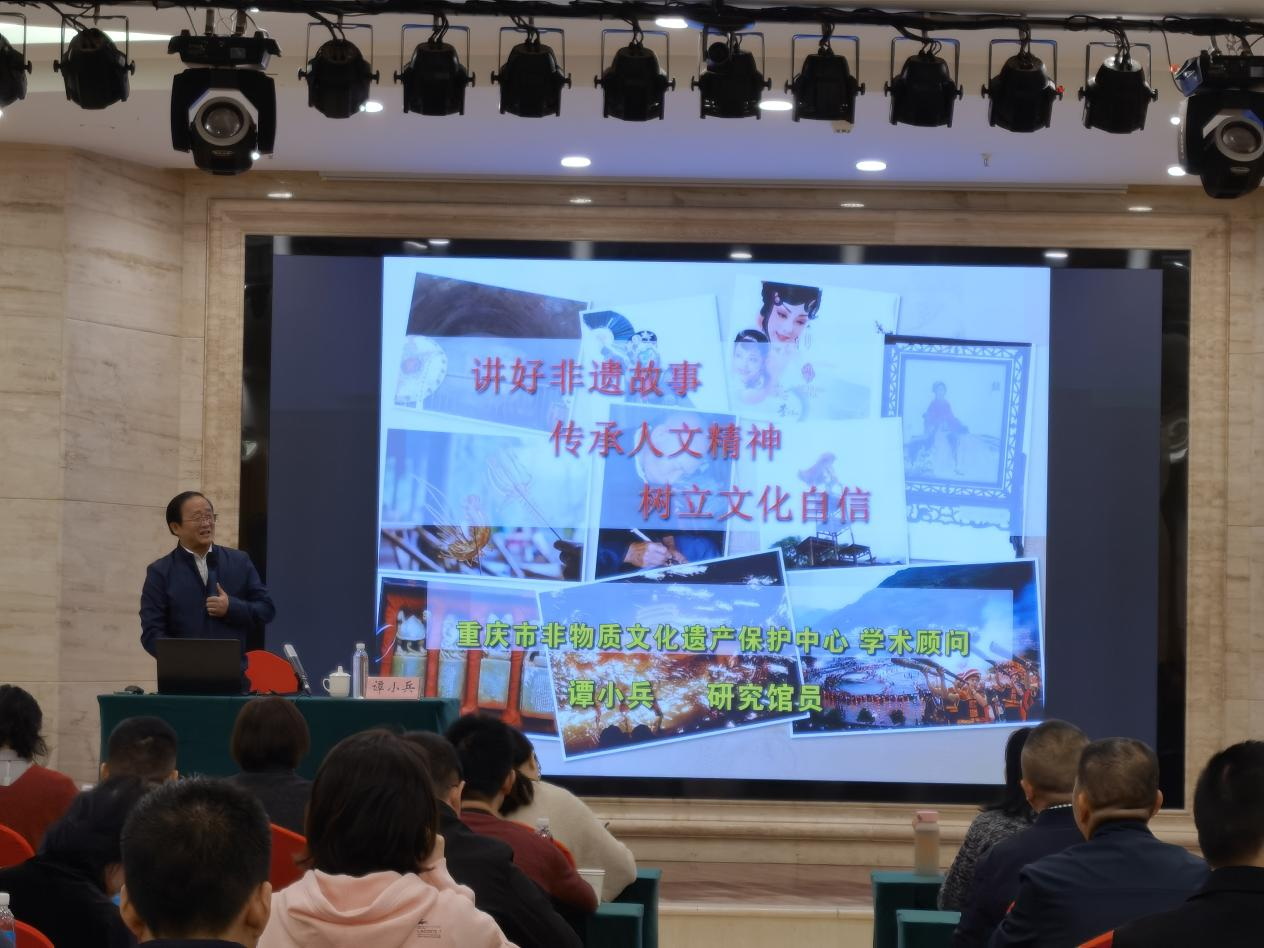 10月30日,重庆中华文化学院举办“聆听山水回响·传承巴渝文脉”文化讲堂,特邀重庆市文化和旅游研究院原副院长、研究馆员谭小兵以《讲好非遗故事,传承人文精神,树立文化自信》为题作专题讲座。重庆中华文化学院培训班学员及部分学院教职工参加。