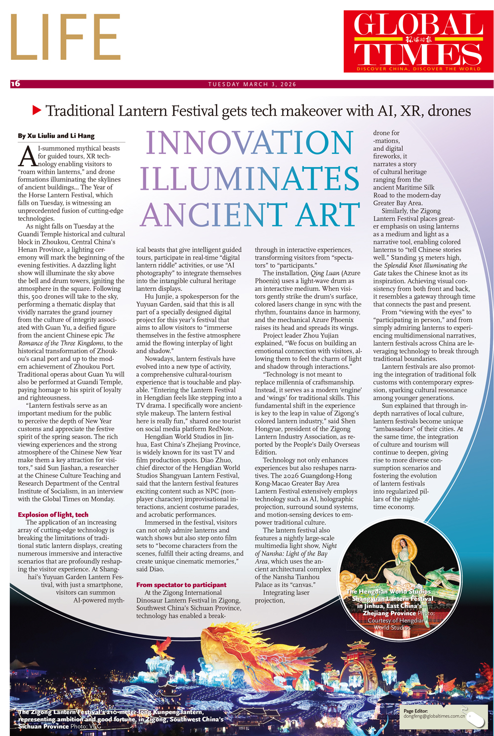 Hengdian World Studios in Jinhua, East China's Zhejiang Province, is widely known for its vast TV and film production spots. Diao Zhuo, chief director of the Hengdian World Studios Shangyuan Lantern Festival, said that the lantern festival features exciting content such as NPC (non-player character) improvisational interactions, ancient costume parades, and acrobatic performances.