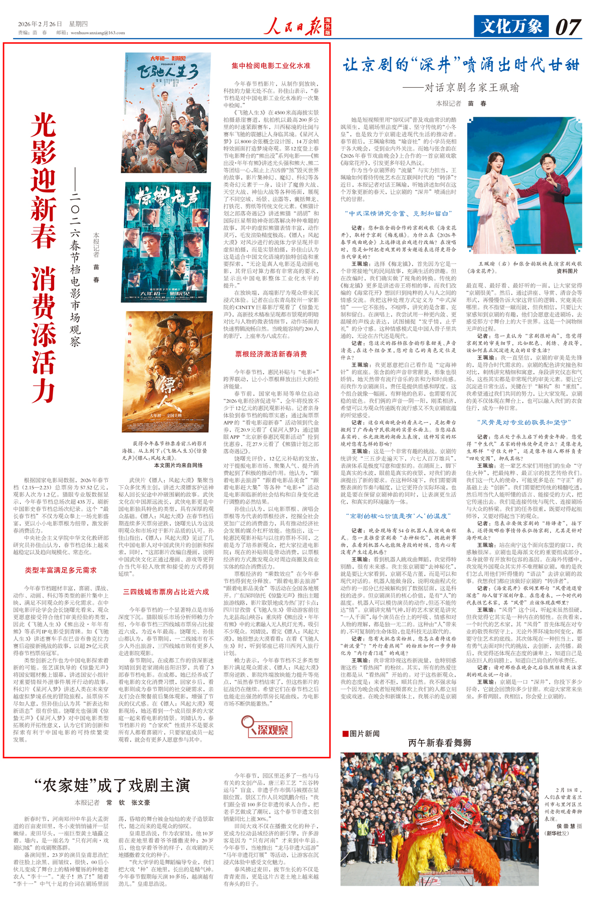 近期,中华文化学院研究员孙佳山先后多次接受中央广播电视总台、《人民日报》海外版、Global Times等中央媒体的采访,就春节档电影、春节节日消费与文旅融合等话题发表评论,在海峡两岸以及国际社会都取得了良好的传播效果。以下是采访报道。